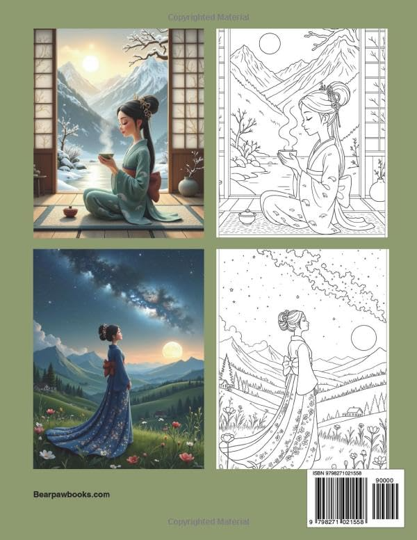 Discover the elegance and serenity of Japan with 44 beautiful coloring images paired with 44 fully colored inspiration pages. This all-ages coloring book features Japanese women in traditional gowns set in peaceful landscapes. Relax, de-stress, and let your creativity bloom with every page.